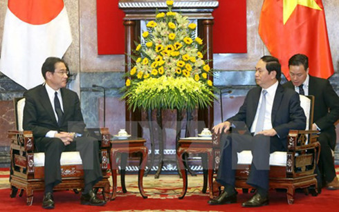President Tran Dai Quang (R) and Japanese Foreign Minister Fumio Kishida