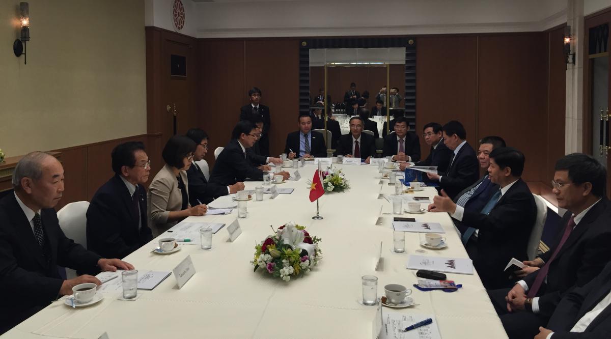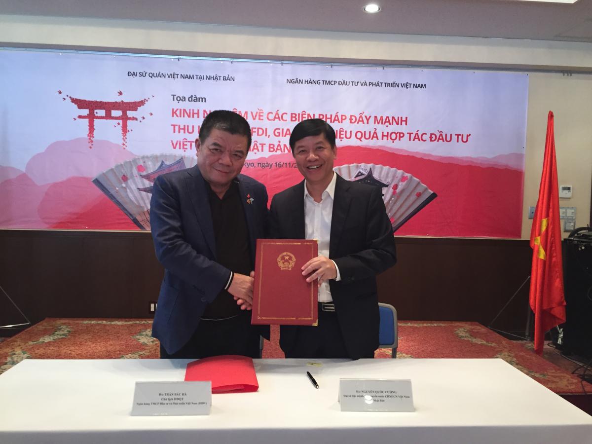 日本との協力と投資誘致のチャンスと促進の仕方について詳しく紹介するために、次の1116日に、東京のベトナム大使館で駐日ベトナム大使館とBIDVとの共催で本代表団参加の地方自治体と企業の勉強会を開催しました。勉強会の際、グエン・クオック・クオン大使とチャン・バック・ハー会長は、協力覚書を締結しました。これにより、今後5年間、2016年から2020年までベトナムの北中部と南中部(タン・ホア省からビン・トゥアン省まで全部12省)を優先的に、越日経済の連結性強化の各プロジェクト実施を支援するために、BIDVが、ベトナム大使館に対して、75万米ドルを供与することをコミットしました。