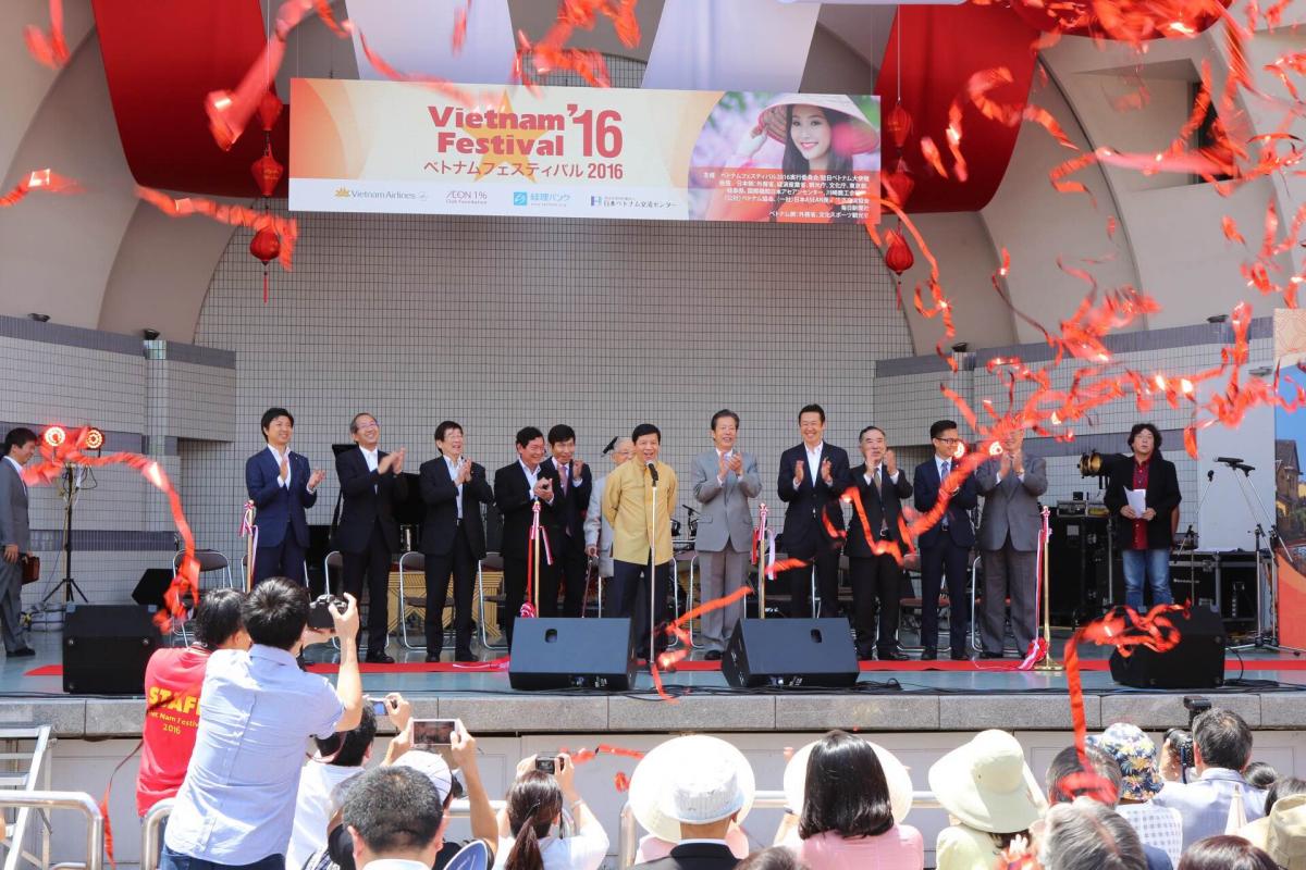 ベトナムフェスティバル2016の開会式には、創設者松田岩夫元国務大臣、ベトナム側実行委員長グエン・クオック・クオン駐日ベトナム大使、フイン・ヴィン・アイベトナム文化スポーツ観光省副大臣、公明党代表山口那津男参議院議員閣下、日本国外務省政務官黄川田仁衆議院議員閣下、文部科学省副大臣冨岡勉衆議院議員閣下、小林正明地球環境審議官、駐日各国大使館の代表及び数千人の日本人、日本在住のベトナム人とその他の各国人が参加しました。