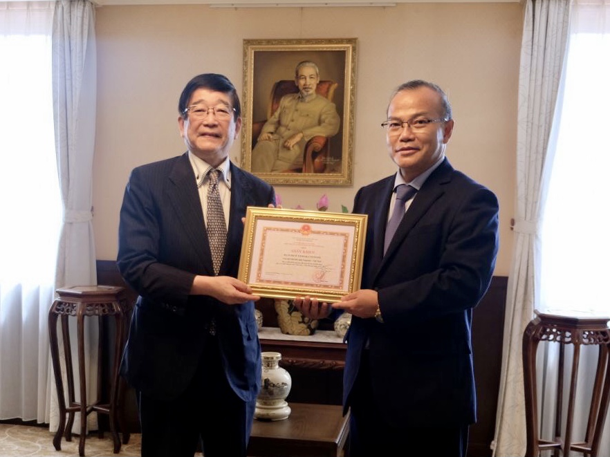 Đại sứ Vũ Hồng Nam trao Giấy khen Đại sứ cho Hạ Nghị sỹ Tomioka Tsutomu,