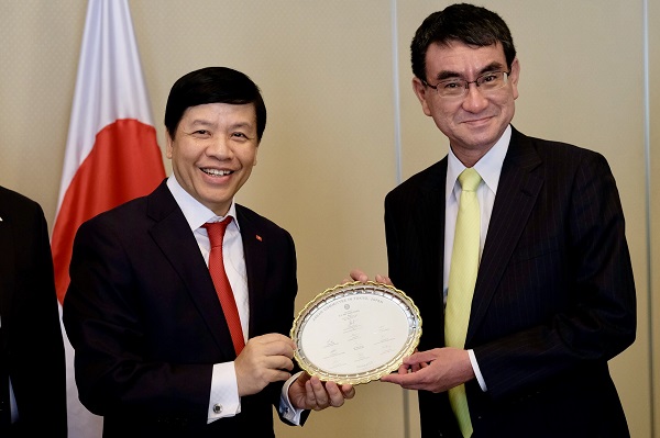 Ngoại trưởng Nhật Bản Kono nhận quà lưu niệm từ Đại sứ Nguyễn Quốc Cường