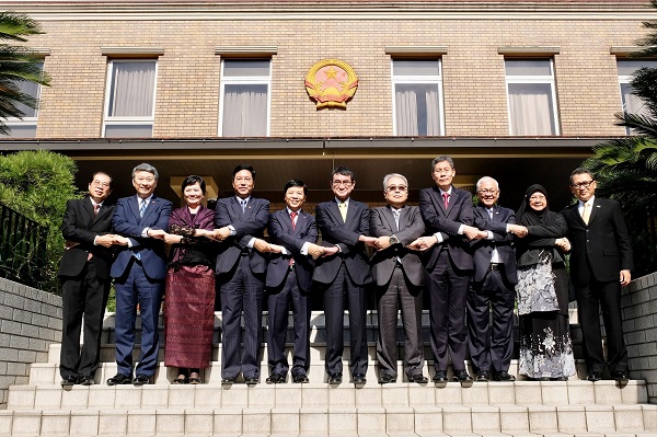 Đại sứ 10 nước ASEAN chụp ảnh lưu niệm với Ngoại trưởng Kono