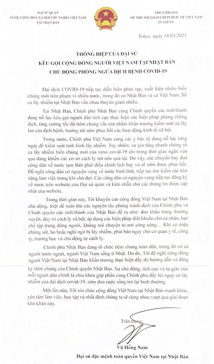 THÔNG ĐIỆP CỦA ĐẠI SỨ KÊU GỌI CỘNG ĐỒNG NGƯỜI VIỆT NAM TẠI NHẬT BẢN CHỦ ĐỘNG PHÒNG NGỪA DỊCH BỆNH COVID-19