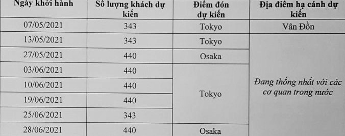 Đại sứ quán thông báo dự kiến các chuyến bay hỗ trợ đưa công dân từ Nhật Bản về nước cách ly tại cơ sở quân đội trong tháng 05-06/2021 như sau: