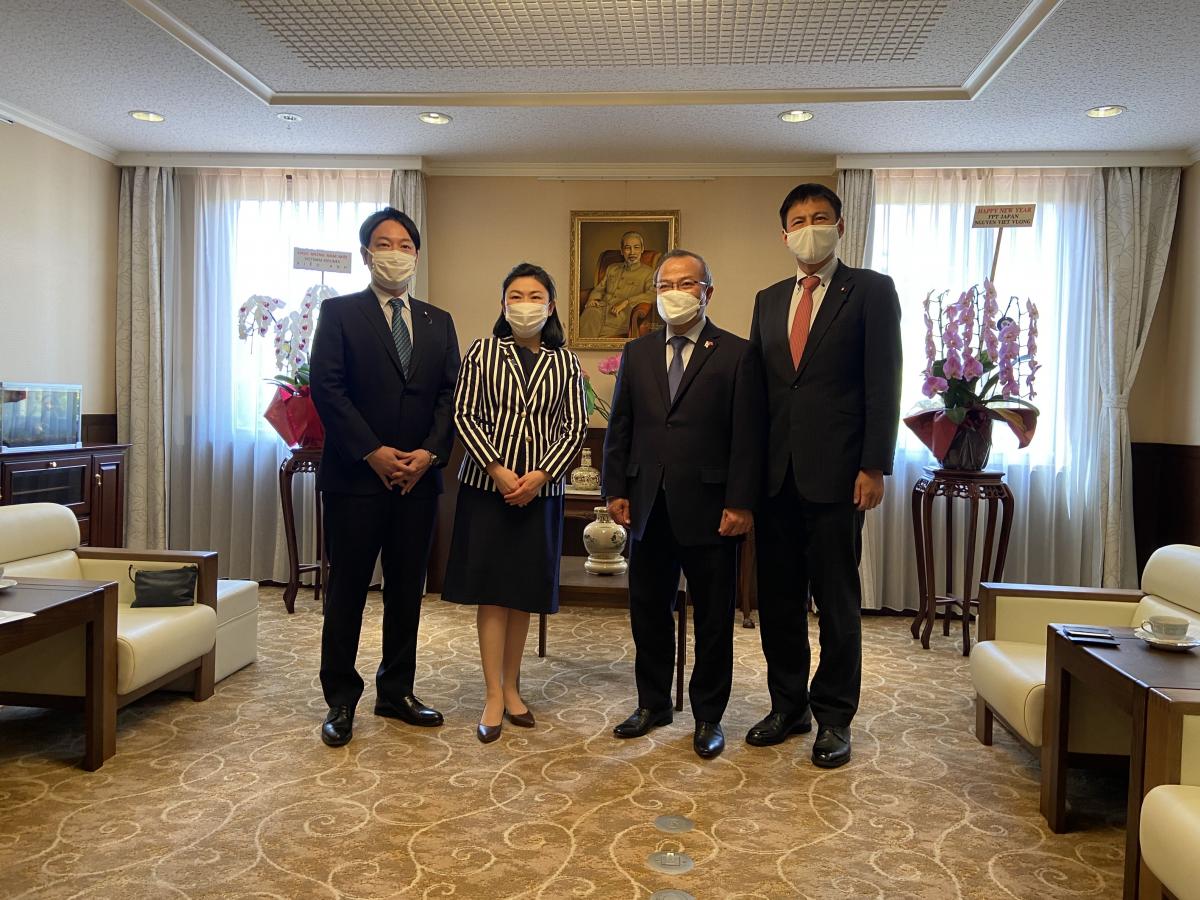 Ngày 19/4, bà Makishima Karen, Hạ nghị sĩ, Trưởng Ban Thanh niên đảng Dân chủ Tự do Nhật Bản (LDP), cùng Hạ nghị sĩ Ogura Masanobu, Quyền Trưởng Ban thanh niên LDP, Hạ nghị sĩ Takei Shunsuke, Trưởng phòng quốc tế, Ban thanh niên LDP và các cán bộ của Ban Quốc tế, Ban Thanh niên đảng LDP đã đến thăm Đại sứ quán.