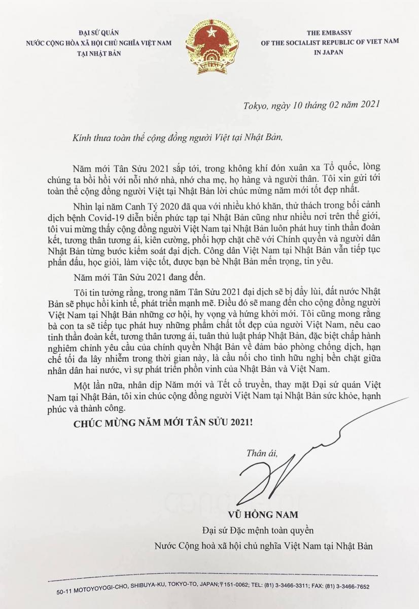 Đại sứ quán Việt Nam tại Nhật Bản kính chuyển Cộng đồng người Việt tại Nhật Bản thư chúc Tết từ Đại sứ Vũ Hồng Nam.